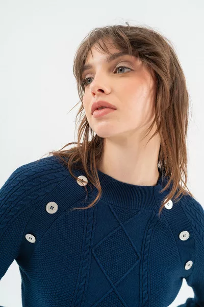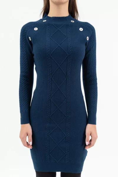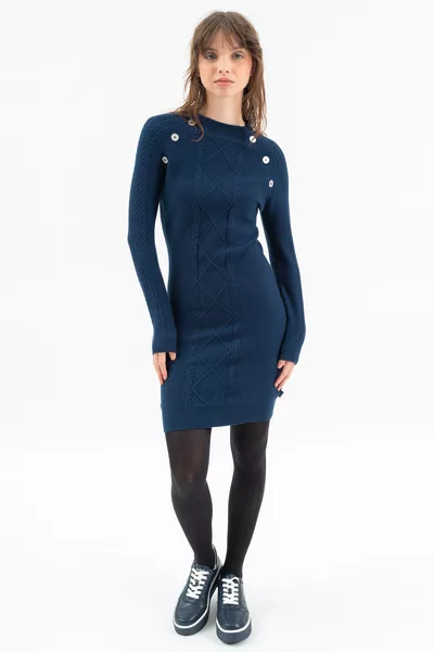 Női vékony kötött ruha. Szűk fazon. Fémgombokkal díszítve.
