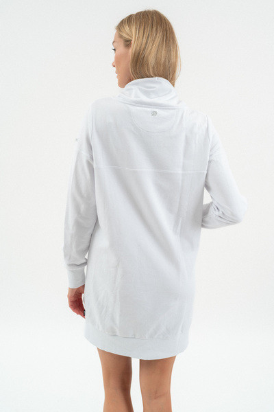 Női magasnyakú ruha rugalmas anyagból. Lezser fazon. Alapanyaga belül bolyhozatlan. Hímzéssel díszítve.