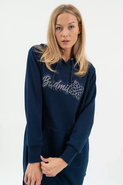 Női kapucnis ruha. Alapanyaga belül plüss. Lezser fazon. Strasszokkal díszítve.