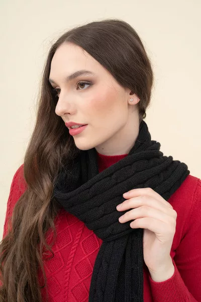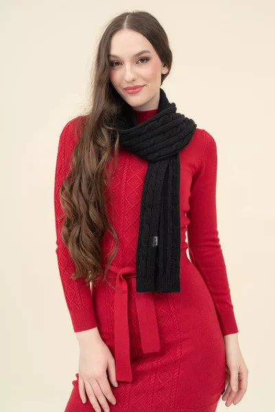 Női kötött sál. Műbőr címkével díszítve.
