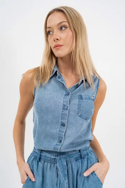 ujjatlan női blúz szövött anyagbólenyhén karcsúsított fazon - fémcímkékkel díszítve<br> <br><p>
