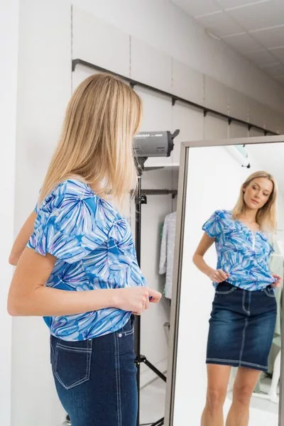 női rövid ujjú blúz lezser fazon - alján gumizott - fémcímkékkel díszítve<br> <br> <p>