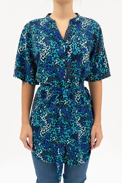 rövid ujjú női blúz enyhén karcsúsított, hosszított fazon - derekán övvel - fémcímkékkel díszítve<br> <br><p>