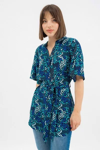 rövid ujjú női blúz enyhén karcsúsított, hosszított fazon - derekán övvel - fémcímkékkel díszítve<br> <br><p>