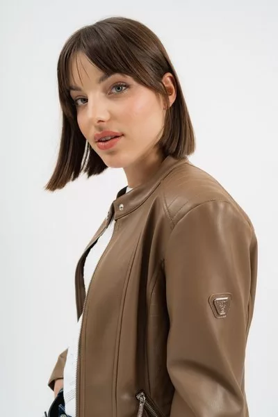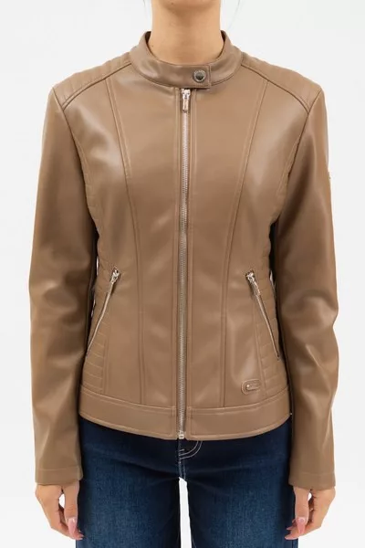 női műbőr dzseki karcsúsított, rövid fazon - fémcímkékkel díszítve <br> <br><p>Ez a <strong>női műbőr dzseki</strong> karcsúsított, rövid fazonjával modern, letisztult megjelenést biztosít. A <strong>karcsúsított szabás</strong> kényelmes illeszkedést ad, miközben kiemeli az alakot. A dzseki visszafogott <strong>fémcímkés díszítéssel</strong> készül, amely egységes, letisztult összhatást eredményez.</p>
