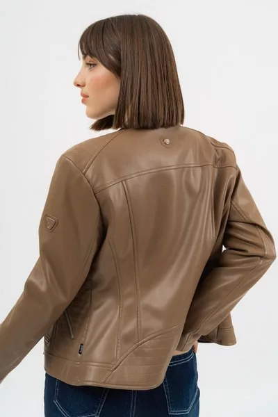 női műbőr dzseki karcsúsított, rövid fazon - fémcímkékkel díszítve <br> <br><p>Ez a <strong>női műbőr dzseki</strong> karcsúsított, rövid fazonjával modern, letisztult megjelenést biztosít. A <strong>karcsúsított szabás</strong> kényelmes illeszkedést ad, miközben kiemeli az alakot. A dzseki visszafogott <strong>fémcímkés díszítéssel</strong> készül, amely egységes, letisztult összhatást eredményez.</p>