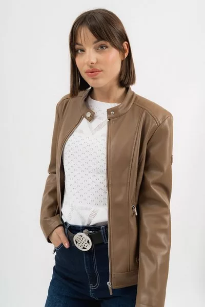női műbőr dzseki karcsúsított, rövid fazon - fémcímkékkel díszítve <br> <br><p>Ez a <strong>női műbőr dzseki</strong> karcsúsított, rövid fazonjával modern, letisztult megjelenést biztosít. A <strong>karcsúsított szabás</strong> kényelmes illeszkedést ad, miközben kiemeli az alakot. A dzseki visszafogott <strong>fémcímkés díszítéssel</strong> készül, amely egységes, letisztult összhatást eredményez.</p>
