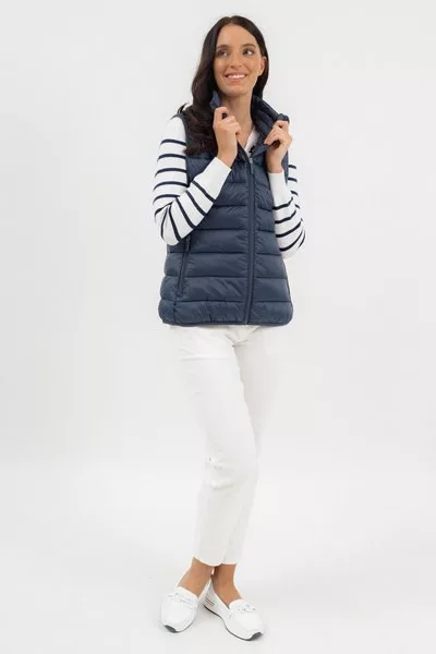 női steppelt vékony mellény anyaga vízlepergető - enyhén karcsúsított fazon - belső zsebek - gumicímkékkel díszítve<br> <br><p>Ez a <strong>női steppelt vékony mellény</strong> praktikus és stílusos választás az átmeneti időszakra. A <strong>vízlepergető anyag</strong> védelmet nyújt a kisebb eső és a szél ellen, míg az <strong>enyhén karcsúsított fazon</strong> nőies sziluettet biztosít.