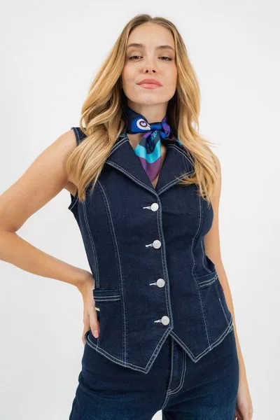 női farmermellénykarcsúsított fazon - fémcímkékkel díszítve - A termék a divatos, intenzív festés miatt, az első pár mosás alkalmával eresztheti a színét, ezért ajánlott elkülönítve mosni. - A kopás elkerülésének érdekében érdemes kifordítva mosni. - <br> <br> <p>