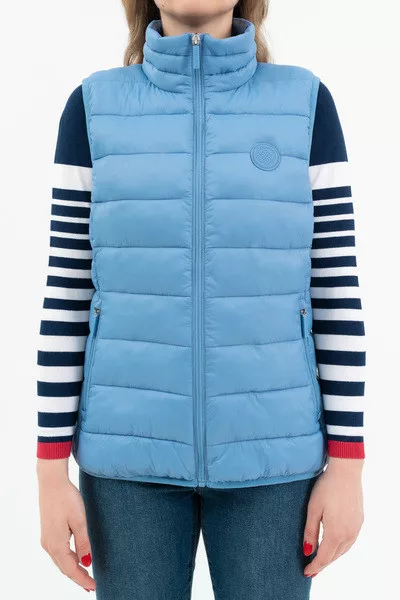 Női steppelt vékony mellény. Enyhén karcsúsított fazon. Belső zsebek. Gumicímkékkel díszítve.