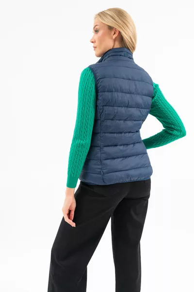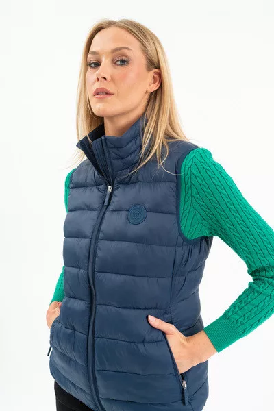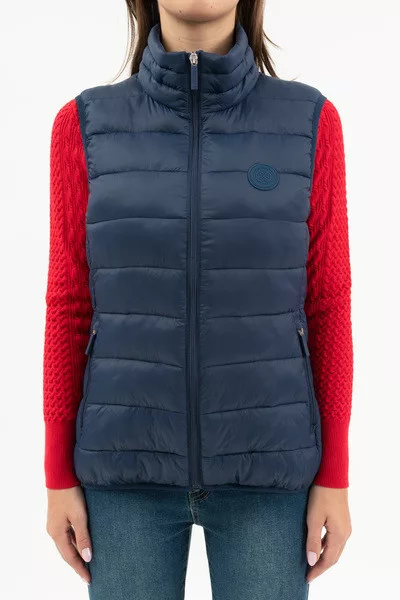 Női steppelt vékony mellény. Enyhén karcsúsított fazon. Belső zsebek. Gumicímkékkel díszítve.