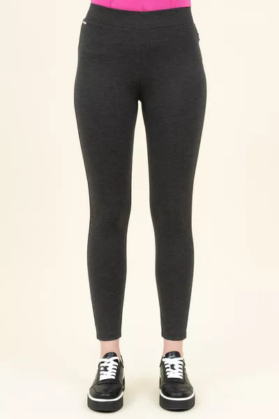 Női leggings rugalmas anyagból. Fémcímkével díszítve.