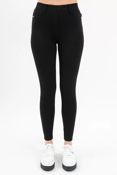 Női leggings rugalmas anyagból. Fémcímkével díszítve.