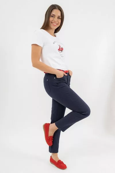 női hosszúnadrág szövött anyagból push-up fazon - derekán keskeny fonott övvel - fémcímkével vagy hímzéssel díszítve<br> <br><p>