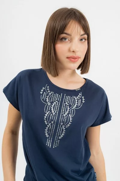 női póló lezser fazon - derekán megköthető - strasszokkal díszítve<br> <br><p>Ez a <strong>női póló</strong> <strong>lezser fazonú</strong>, amely kényelmes, könnyed viseletet biztosít. A <strong>deréknál megköthető kialakítás</strong> lehetővé teszi, hogy a pólót egyénre szabva viselje, miközben nőies sziluettet ad. A modellt csillogó <strong>strasszok</strong> díszítik.</p>