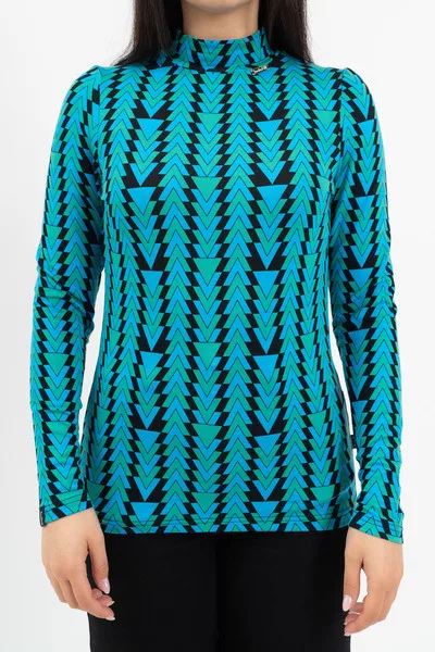 Női vékony magas nyakú felső . Rugalmas anyagból. Szűk fazon. Fémcímkével díszítve.