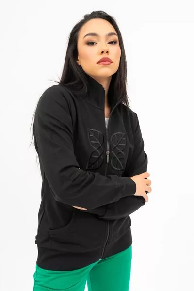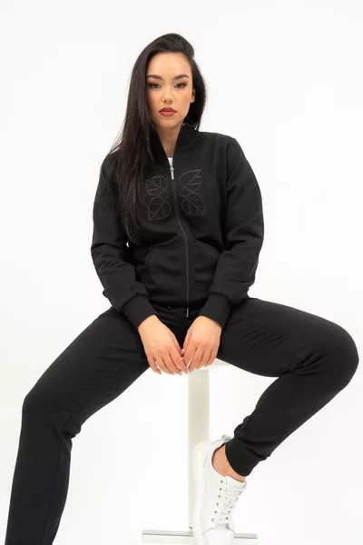 női szabadidőfelső rugalmas anyagból - alapanyaga belül bolyhozatlan - hímzéssel díszítve