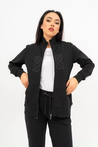 női szabadidőfelső rugalmas anyagból - alapanyaga belül bolyhozatlan - hímzéssel díszítve