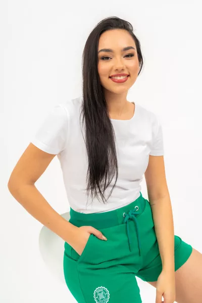 Női short rugalmas anyagból. Alapanyaga belül bolyhozatlan . Szövött címkével díszítve.
