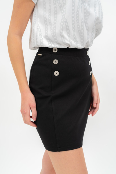 Női miniszoknya rugalmas anyagból. Fémcímkével díszítve.