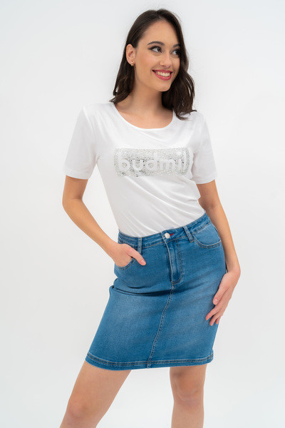 Női farmerszoknya . Fém és műbőr címkével díszítve.