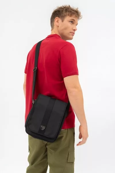 22X27X6 CM - férfi textil oldaltáska - anyaga vízlepergető - cipzáras zsebekkel - állítható vállpánttal - fémcímkével díszítve
