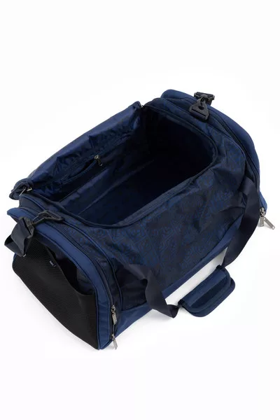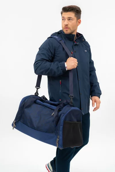 55X30X32 CM. Férfi textil sporttáska, utazótáska . Anyaga vízlepergető . Cipzáras zsebekkel . állítható, leszedhető vállpánttal . Gumicímkével és nyomott mintával díszítve.