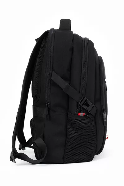34x46x22 cm, 0,68 kg. Alapanyaga vízlepergeto. Mindkét oldalán hálós zseb. Légcsatornás hátlap. Három különálló cipzáros rekesz. Az elso rekeszben rendszerezo zsebek. Boröndre rögzítheto. Laptoptartó: 26 X 33cm.