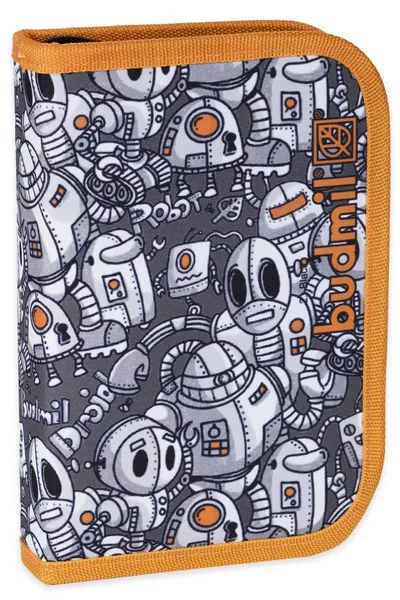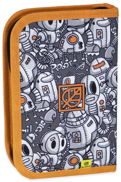 13,5x20 cm. Egyrekeszes nagyméretű tolltartó. Alapanyaga vízlepergető. Robotos mintával. Kihajtható órarendtartóval. 28 ceruzahellyel.