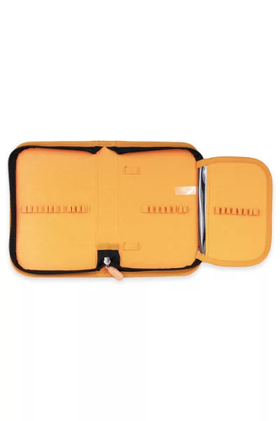 13,5x20 cm. Egyrekeszes nagyméretű tolltartó. Alapanyaga vízlepergető. Robotos mintával. Kihajtható órarendtartóval. 28 ceruzahellyel.