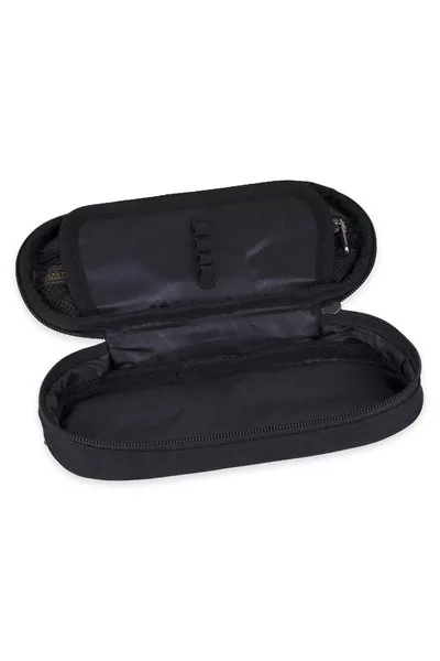 22,2x9 cm. Egyrekeszes kisméretű tolltartó. Alapanyaga vízlepergető. Fehér applikációval díszítve. Belül cipzáros hálós zsebbel. Kihajtható ceruzatartó 8 ceruzahellyel.