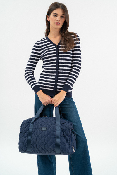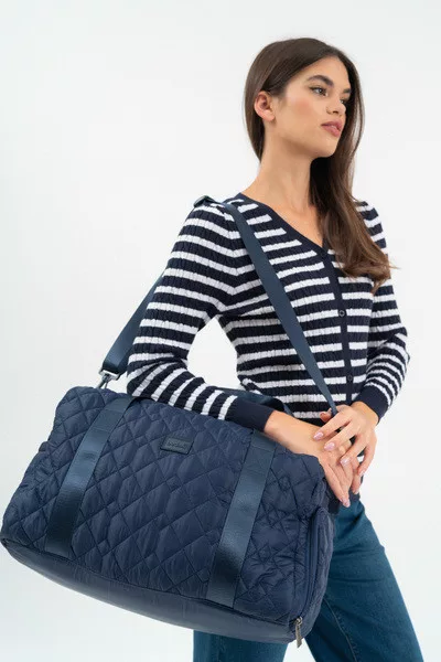 41X26X21 cm. Női sporttáska, utazótáska. Belül cipzáros zsebek. Elkülönített cipőtartó rekesz. állítható, leszedhető vállpánt. Gumicímkével díszítve.
