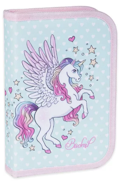 13,5x20 cm. Egyrekeszes nagyméretű tolltartó. Alapanyaga vízlepergető. Pegazus mintával. Kihajtható órarendtartóval. 28 ceruzahellyel.