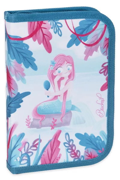13,5x20 cm. Egyrekeszes nagyméretű tolltartó. Alapanyaga vízlepergető. Hableány mintával. Kihajtható órarendtartóval. 28 ceruzahellyel.
