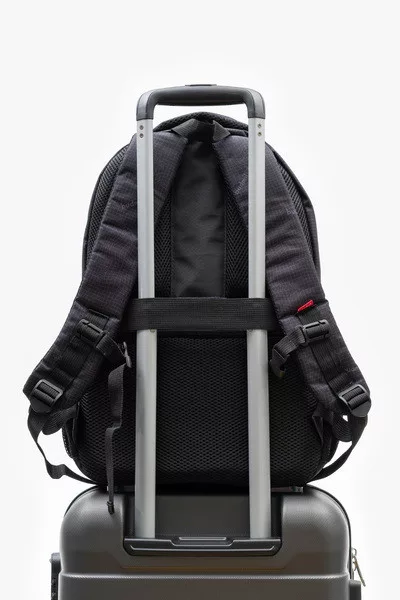 30x44x18 cm, 23L. Alapanyaga vízlepergető. Mindkét oldalán hálós kulacstartó zseb. Hátlapon biztonsági zseb. Három különálló cipzáros rekesz. Az első rekeszben rendszerező zsebek. Laptop tartó. Bőröndre rögzíthető.