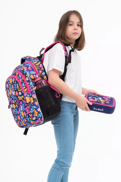 30x43x20 cm, 1,04 kg. Alapanyaga vízlepergető. Fényvisszaverő részletek. Mindkét oldalán hálós kulacstartó zseb. Légcsatornás hátlap . Eleje kikeményített. Különböző testmagasságokhoz állítható pántok. Három különálló cipzáros rekesz. Az első rekeszben rendszerező zsebek. Esővédő huzattal.